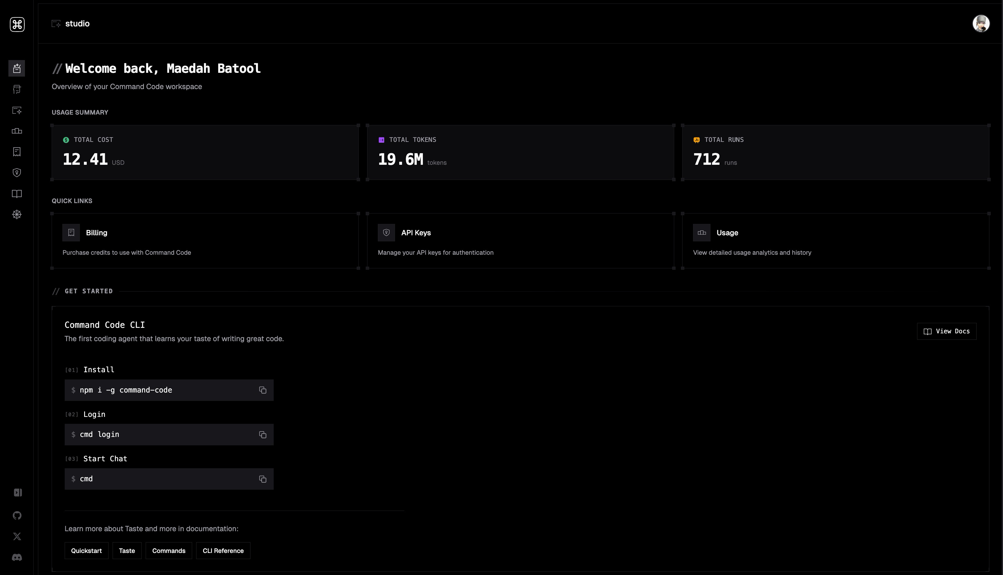 Studio is the home for managing your Command Code workspace. It gives you a single place to view and control your profile, taste packages, API keys, usage, billing, settings, and more.